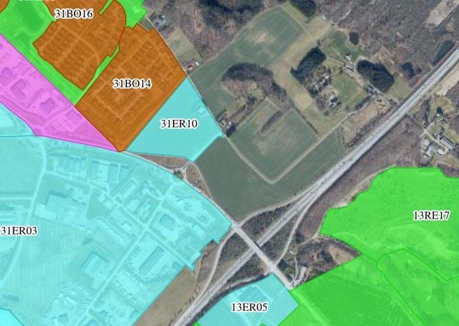 Kort over eksisterende kommuneplanrammer. Nærværende lokalplan nr. 409 omfatter samme areal, som er omfattet af rammeområde 31ER10.