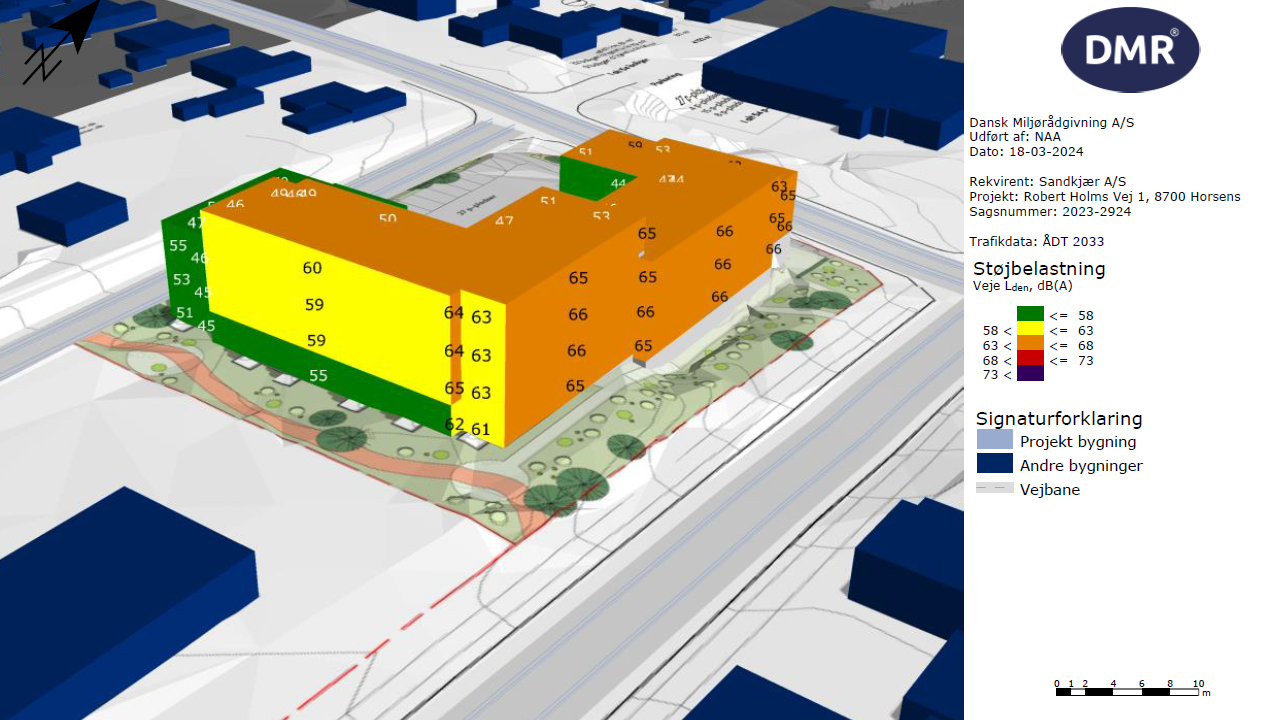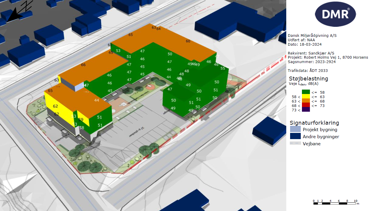 På baggrund af støjberegningerne forventes det, at dele af projektområdets udendørs arealer og facader vil være støjbelastede med overskridelser over den vejledende støjgrænse på 58dB.