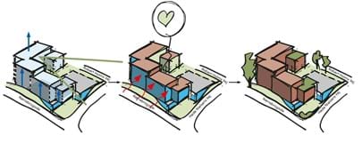 Konceptskitser for bebyggelsens transformation, omfang og fællesskaber