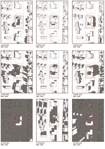 Gårdrummets centrale opholdsareal disponeres og indrettes efter hensyn til skyggepåvirkningen. Opholdsarealet opdeles i to zoner, henholdsvis en zone til ophold og en zone med plads til leg og bevægelse. Den primære opholdszone placeres i gårdrummets nordlige ende, hvor det af skyggediagrammer er påvist, at arealet er solbeskinnede det meste af dagen. Den aktive zone placeres på tilsvarende vis i gårdrummets sydlige del, og indrettes med fokus på leg og bevægelse. Gårdrummets opholdsarealer suppleres med private altaner og ophold på fælles tagterrasser.