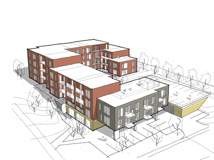 Inden for lokalplanområdet vil der blive mulighed for opførelse af etageboliger i en karrélignende struktur i 2-4 etager. Bebyggelsen opføres på den eksisterende kælder, hvorfra de maksimale antal etager betragtes fra, se nedenstående illustrationer. Bebyggelsen skal opføres i sammenbyggede bygningsenheder i varierende højder, der giver byggeriet et dynamisk udtryk, og samtidig tilpasser sig terrænets naturlige fald mod nord, samt skalaen i det omkringliggende kvarter.