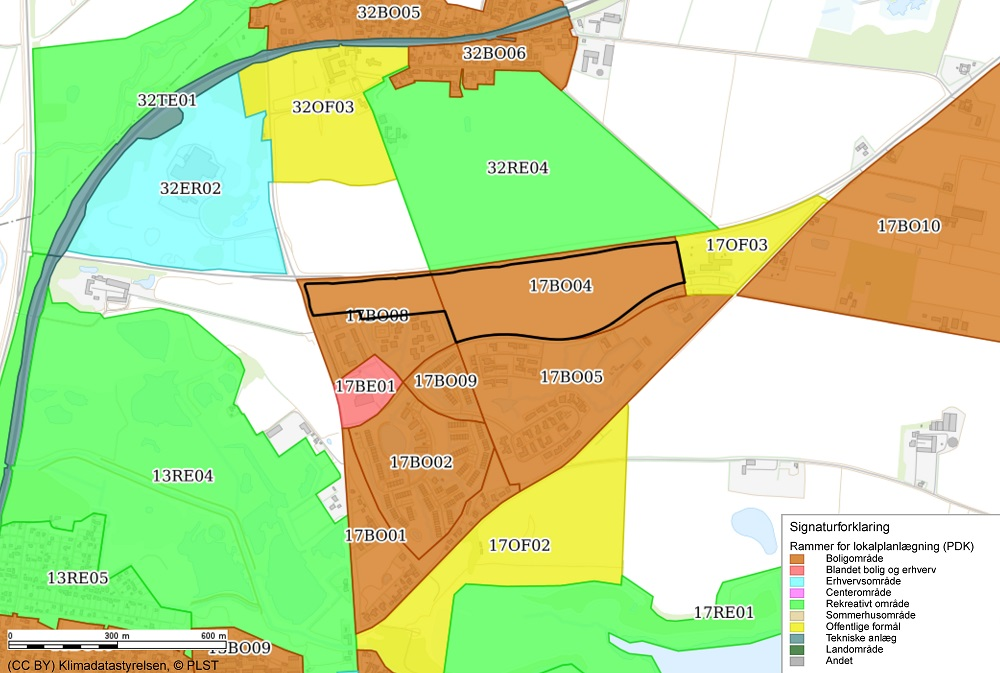 Lokalplanen er omfattet af kommuneplanens rammeområder 17BO04 og 17BO08, der udlægger områderne til boligformål. Da der også ønskes mulighed for udvikling af området til offentlige formål indarbejdes der en ændring i forslag til kommuneplan 2025-2037, der ændrer anvendelsen af området fra boligformål til offentlige formål og boliger, som forudsætning for, at lokalplanen kan gennemføres. Med rammeændringerne i forslag til kommuneplan 2025-2037 reduceres etageantallet samtidig til 2 etager og bebyggelsesprocenten reduceres til 50.