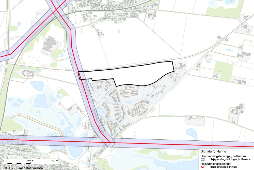 Kort over retningslinjen Højspændingsledninger og naturgasledninger. Lokalplanområdet er markeret med sort streg. Retningslinjen afspejler en luftledning. Ledningen er siden jordlagt og konsekvenszonen reduceret.