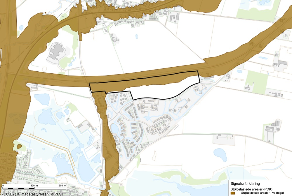 Kort over retningslinjen Støjbelastede arealer. Lokalplanområdet er markeret med sort streg.