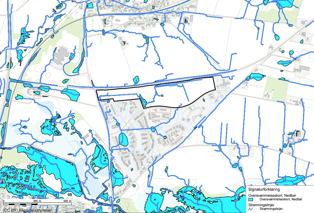 Kort over retningslinjen Klimatilpasning. Lokalplanområdet er markeret med sort streg.