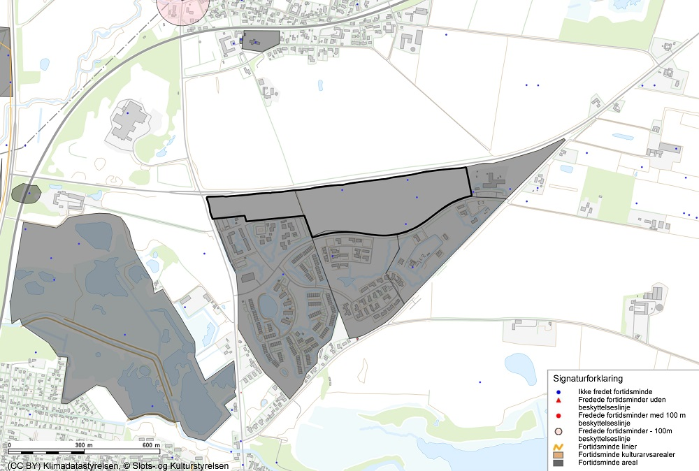 Kort over retningslinjen Fortidsminder og kulturarvsarealer. Lokalplanområdet er markeret med sort streg.