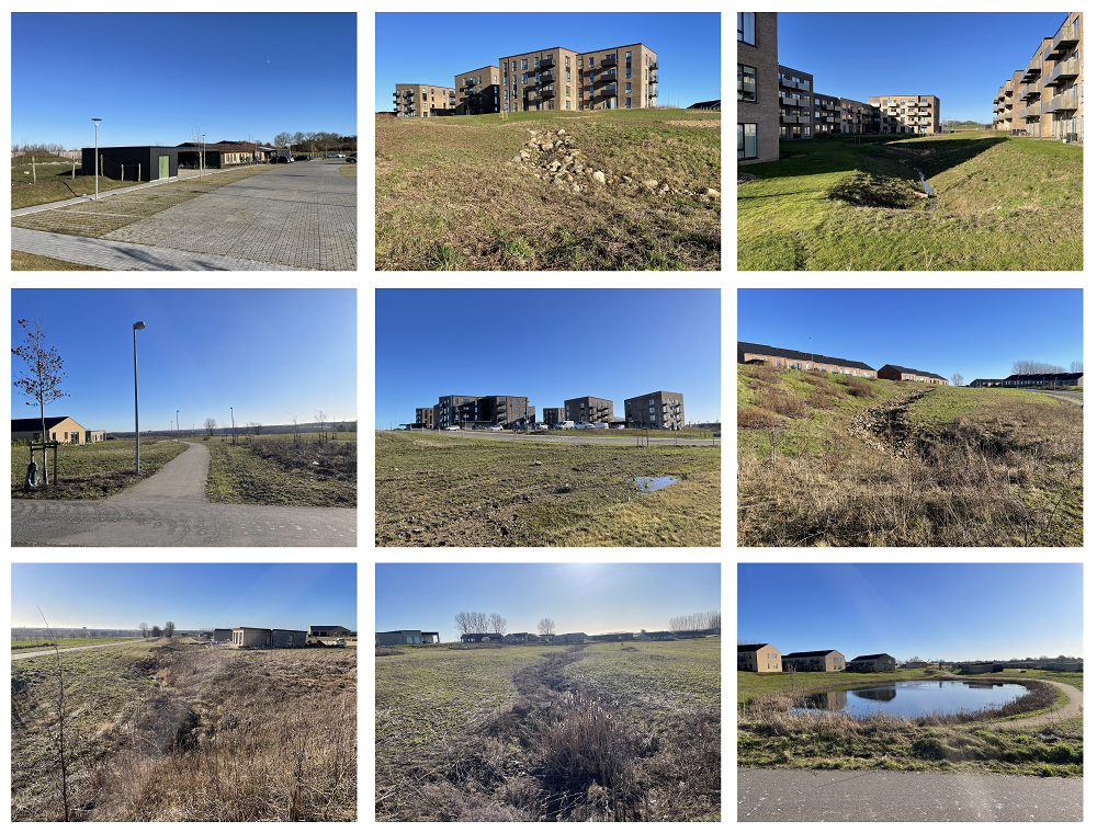 Billeder fra det etablerede område ved Nørrestrand med varierende bebyggelse og åbne grønne områder med synlig vandhåndtering.