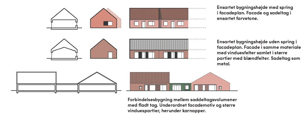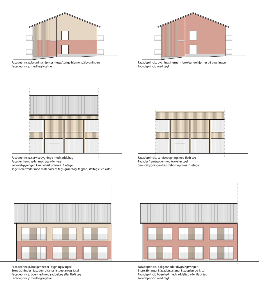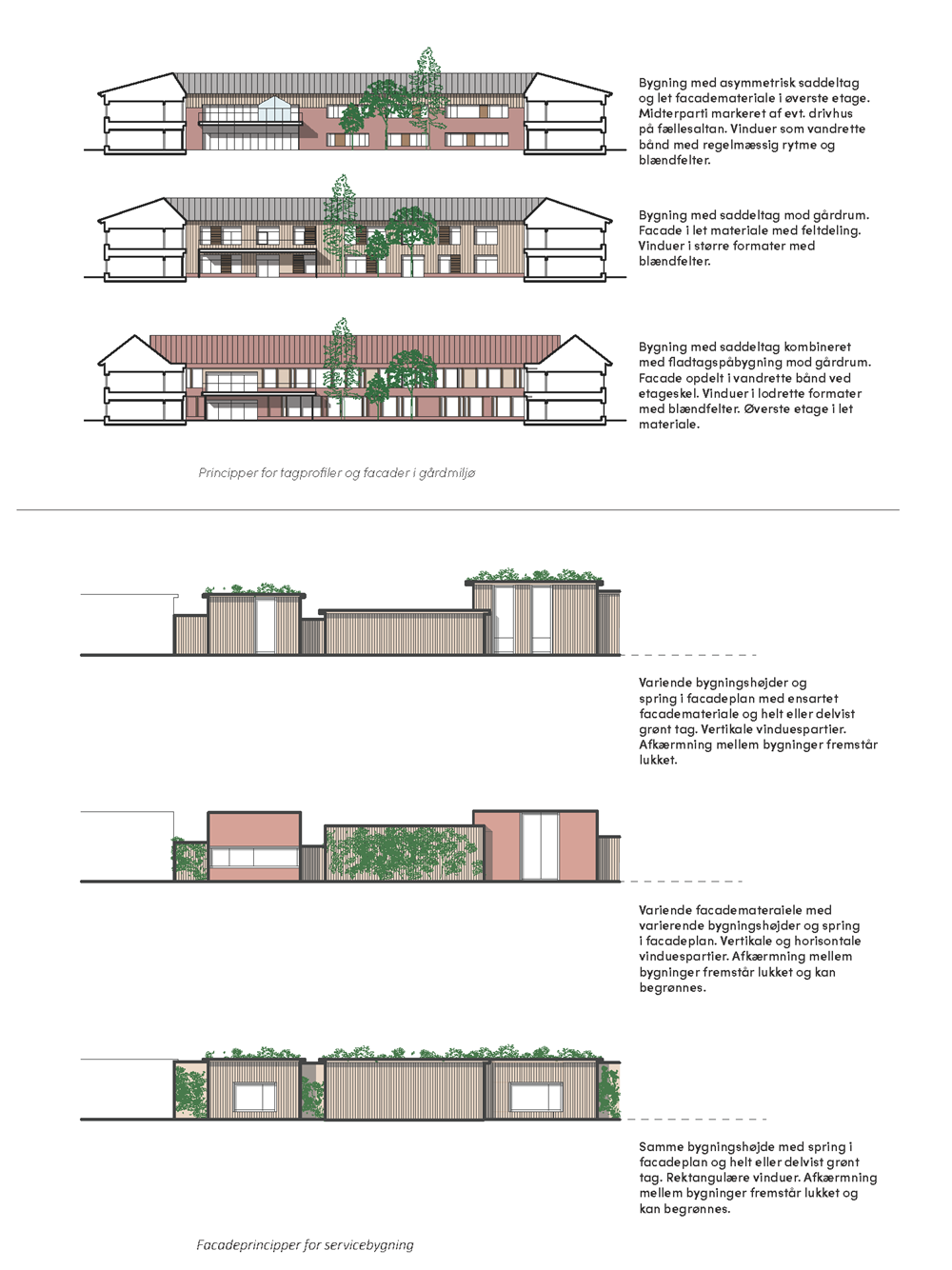 Kortbilag 5 Kortbilag 5A. Principper for facadeforskydning for tæt-lav byggeri i delområde 1 og 3. Kortbilag 5B. Facadeprincipper for bygninger i ét plan, delområde 1 og 3. Kortbilag 5C. Facadeprincipper for plejecenter i to plan, delområde 2. Kortbilag 5D. Principper for tagprofiler og facader i gårdmiljø, samt facadeprincipper for servicebygning, delområde 2. Kortbilag 5E. Facadeprincipper, materialer, tagprofiler for døgninstitution, delområde 4. Kortbilag 5F. Referencer på materialer, farver, tagformer, altaner, facadeopdeling, facadedetaljering.