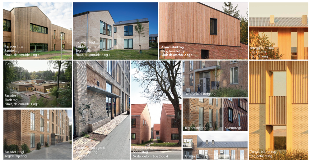 Kortbilag 5 Kortbilag 5A. Principper for facadeforskydning for tæt-lav byggeri i delområde 1 og 3. Kortbilag 5B. Facadeprincipper for bygninger i ét plan, delområde 1 og 3. Kortbilag 5C. Facadeprincipper for plejecenter i to plan, delområde 2. Kortbilag 5D. Principper for tagprofiler og facader i gårdmiljø, samt facadeprincipper for servicebygning, delområde 2. Kortbilag 5E. Facadeprincipper, materialer, tagprofiler for døgninstitution, delområde 4. Kortbilag 5F. Referencer på materialer, farver, tagformer, altaner, facadeopdeling, facadedetaljering.