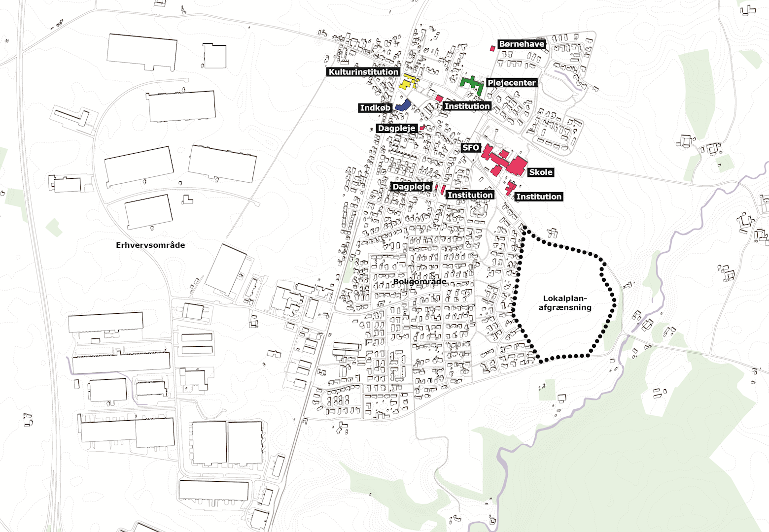 Der er kort afstand fra lokalplanområdet til både skole, institutioner, indkøb, fritidsfaciliteter mv. Udvikling af lokalplanområdet til en ny bydel i Gedved, vil fremtidigt understøtte det allerede stærke udbud af aktiviteter og tilbud, som er til stede i dag. Se kortbilag 2D.