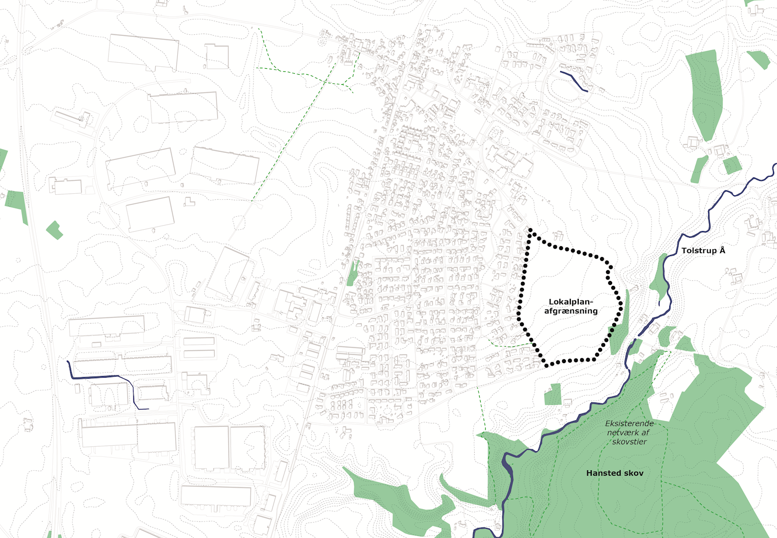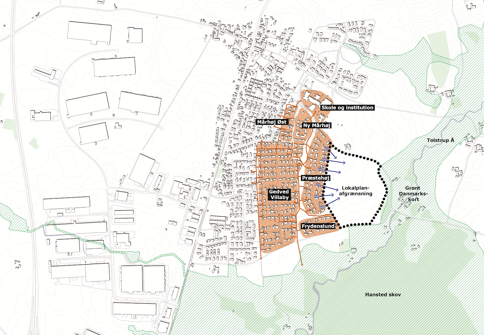 Lokalplanområdet ligger lige op ad Tolstrup Å og Hansted skov mod øst/sydøst, og er bl.a. en del af udpegningen for Grønt Danmarkskort, kun adskilt af Lykkebjergvej og Skovvej. Afgrænsningen af sammenhængende arealer til Grønt Danmarkskort skal sikre den overordnede grønne sammenhæng i kommunen som helhed. Lokalplanområdet og den kommende bydel vil derfor være et vigtigt bindeled mellem den eksisterende bystruktur og de stærke naturkvaliteter på kanten af Gedved, særligt mod øst/sydøst. Særligt de visuelle forbindelser, i form af kig til bakkelandskabet er unikke for området. Se kortbilag 2A.