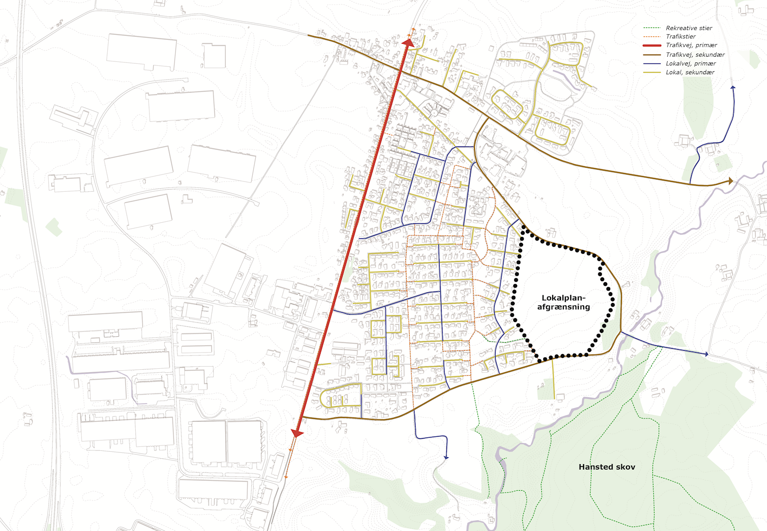 Det overordnede vejnet omkring lokalplanområdet skal i takt med udbygning af byen, opgraderes for at kunne afvikle en stadig større mængde boligtrafik. Det er smalle veje, som hverken har faciliteter til sidevejstrafik, krydsningsmuligheder eller sideanlæg til at færdes langs vejen. Flere tiltag omkring lokalplanområdet er med i arbejdet med Mobilitetsplan 2035. Se kortbilag 2C.