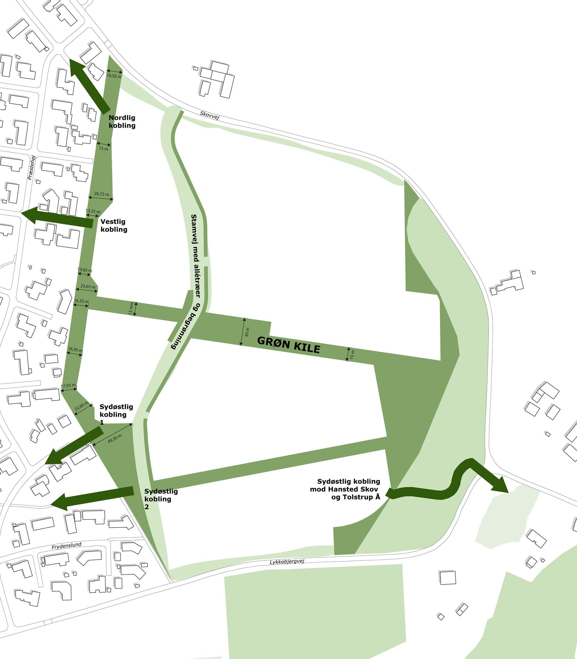 Kortbilag 7 - Den grønne kile, en begrønnet stamvej og de centrale koblinger til den eksisterende byrand og landskabet (Hansted Skov og Tolstrup Å).
