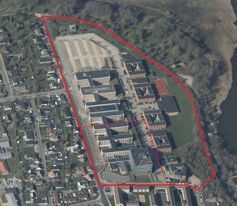 Skråfoto med illustration af afgrænsning af eksisterende lokalplan 2017-04 (tyk, rød streg) og afgrænsning af Tillæg nr. 1 (tynd, rød streg).