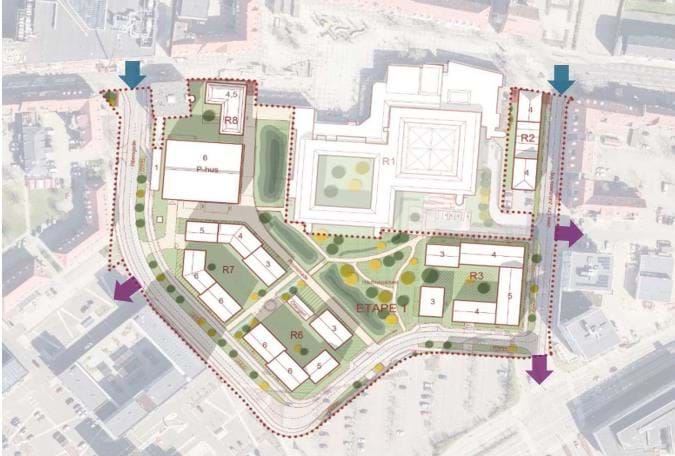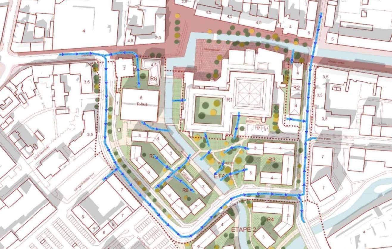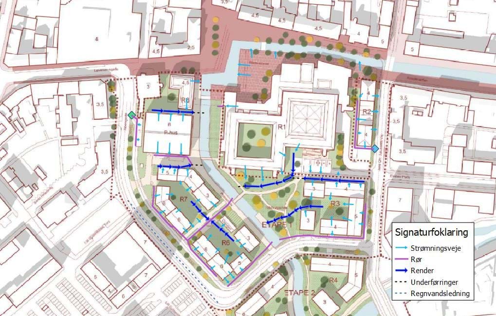 De overordnede strømningsveje ved ekstremregn som strømmer ind og ud af området ses på Figur 7.5. Før etablering af åloopet vil overfladevandet strømme fra Løvenørnsgade og gaden Rådhustorvet, hvor det samles og forsætter syd nedad Ribersgade. Ved Ribersgade strømmer overfladevand ud ved Lilli Gyldenkildes Torv, mens noget ekstremregn fortsætter ad Ribersgade og løber videre både mod syd af Jens Christian Juliussens Vej og øst af Emilies Plads. En større strømningsvej afvander også overfladevand ved ekstremregn ned gennem planområdet fra Åboulevarden både nord og nordøst via Jens Christian Juliussens Vej.