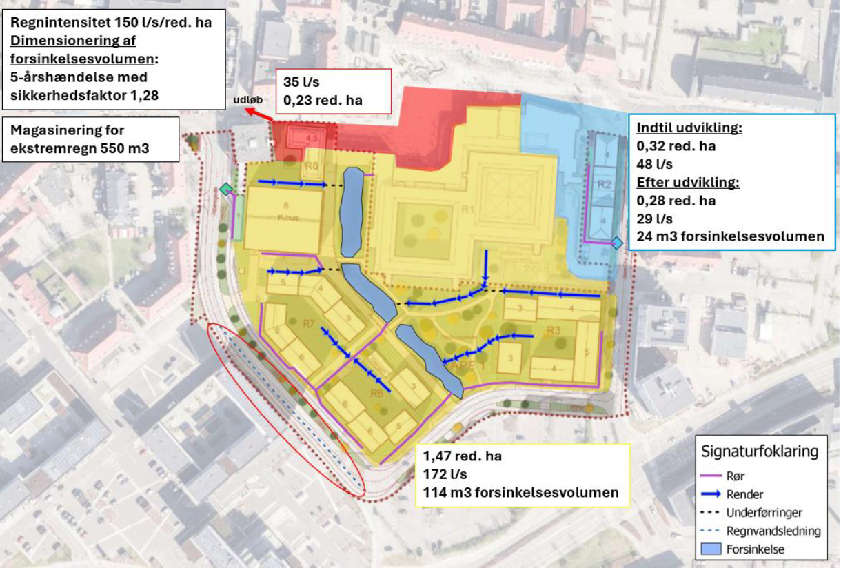 Figur 7.3: Kort over render på terræn, regnvandsledninger samt forsinkelsesområde til afledning og håndtering af hverdagsregn før åloopet realiseres. Farverne illustrerer hvor vandet afvander til. Det gule område ledes gennem render til lavningerne før det ledes til regnvandsledningen i Ribersgade (rød markering).