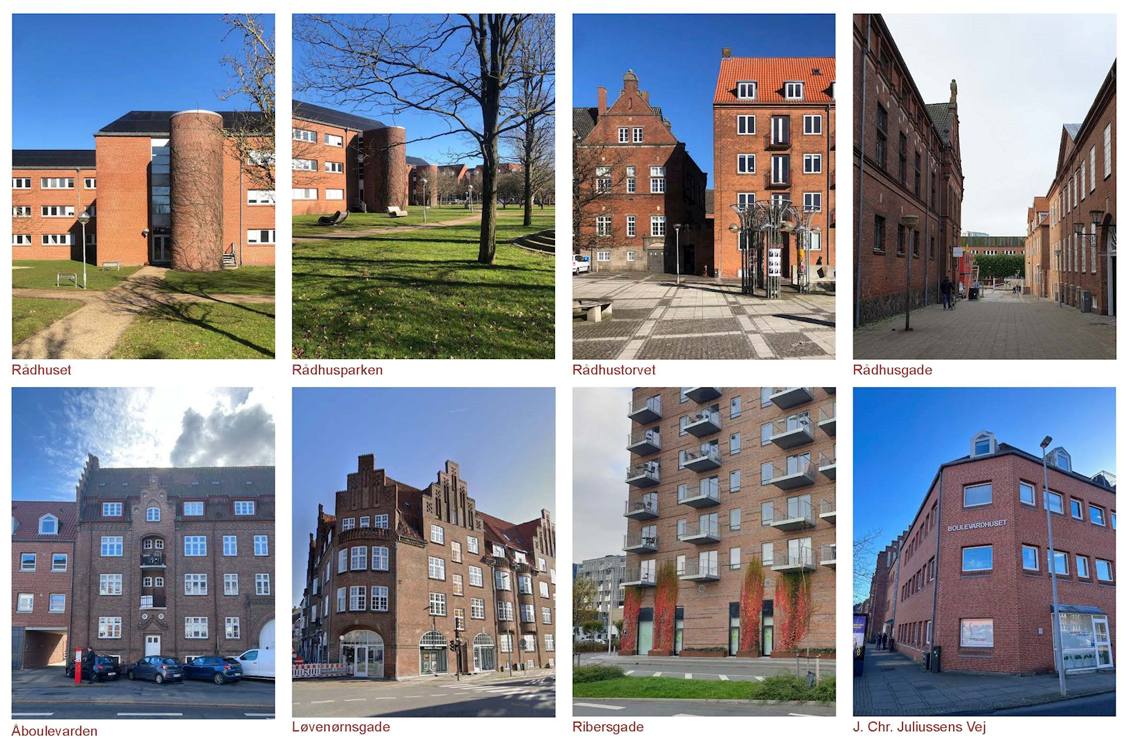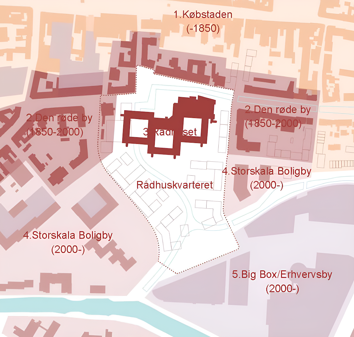 Rådhuskvarteret er placeret i et område med rigtig mange typologier af bebyggelse. Mod nord møder kvarteret den oprindelig købstad, hvor den primære handelsgade, Søndergade, stadig ligger i dag.