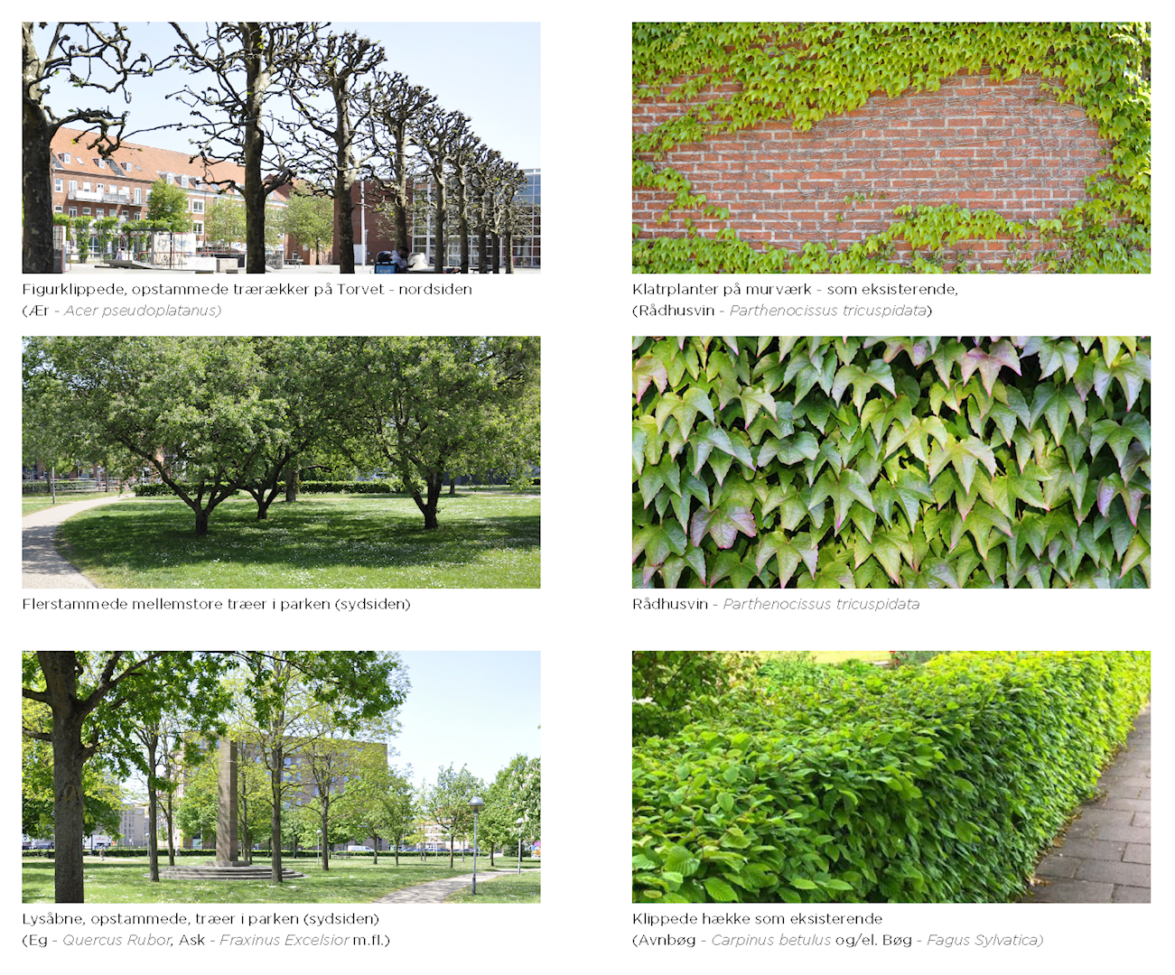 På pladsen findes der lige rækker af stamhække (opstammede og geometrisk figurklippede træer), klare rumlige opdelinger og kantzoner langs facaderne.