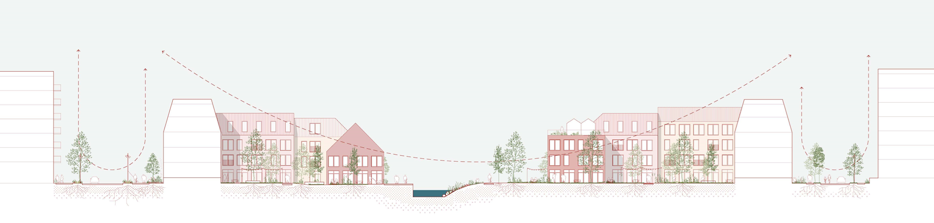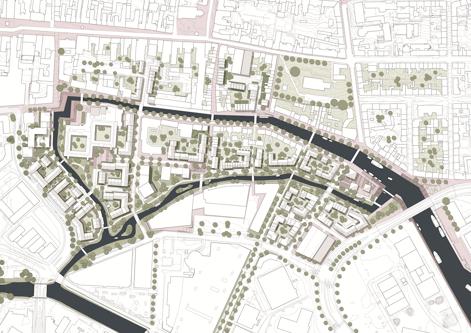 Planlægningen giver mulighed for, at der kan etableres boliger, erhverv, et p-hus samt grønne byrum og vandhåndtering på terræn.