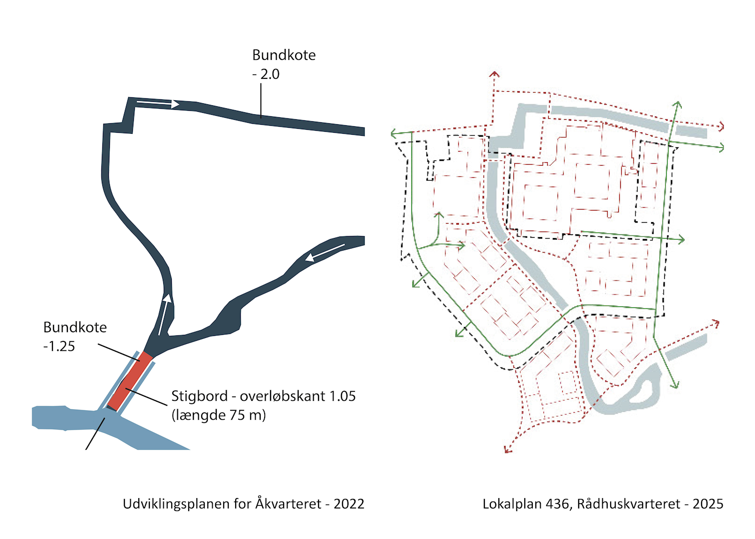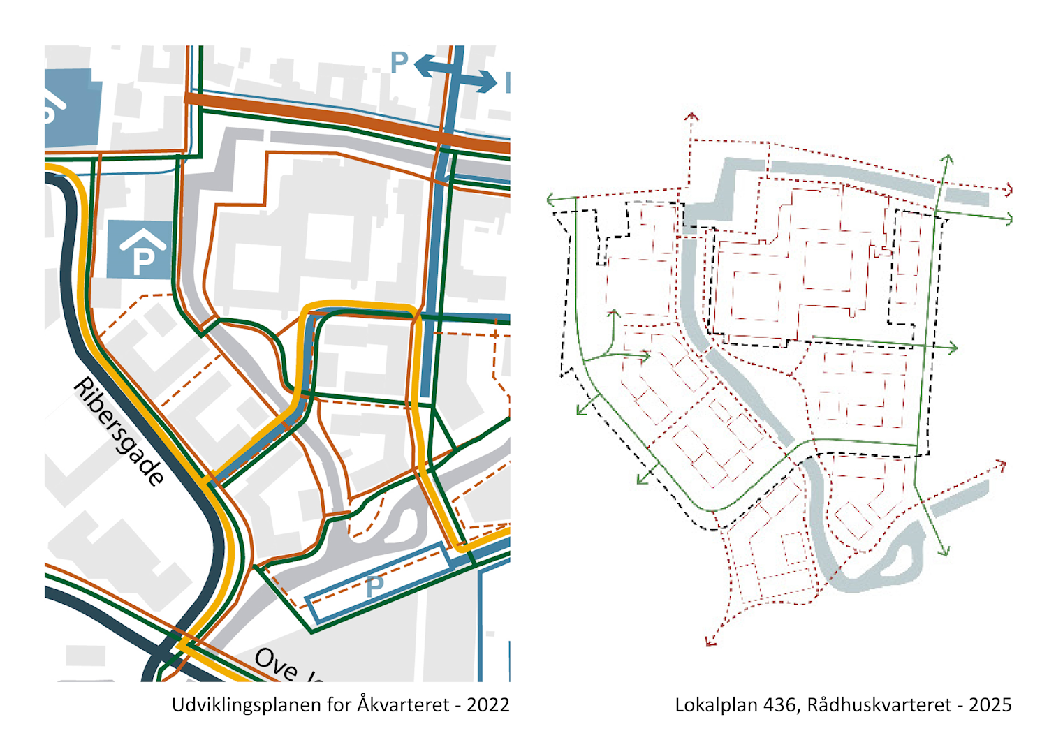 Diagrammer der viser principper fra udviklingsplanen og lokalplanen, byggefelter, åens tracé og parkeringsprincipper.