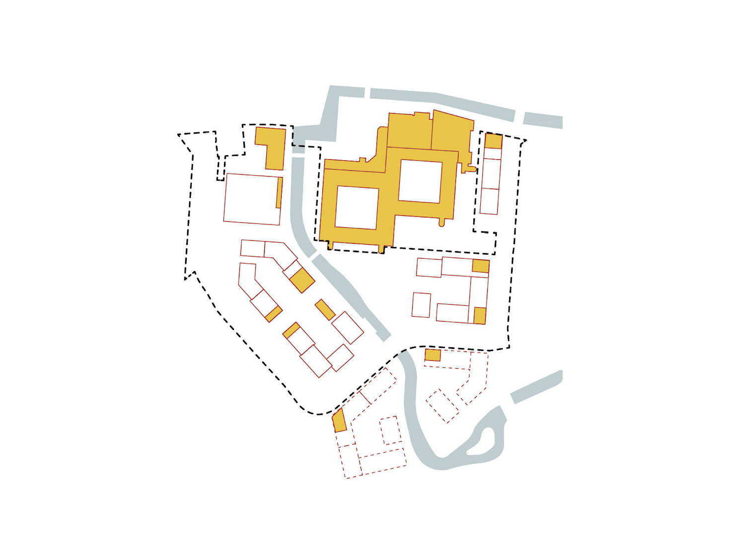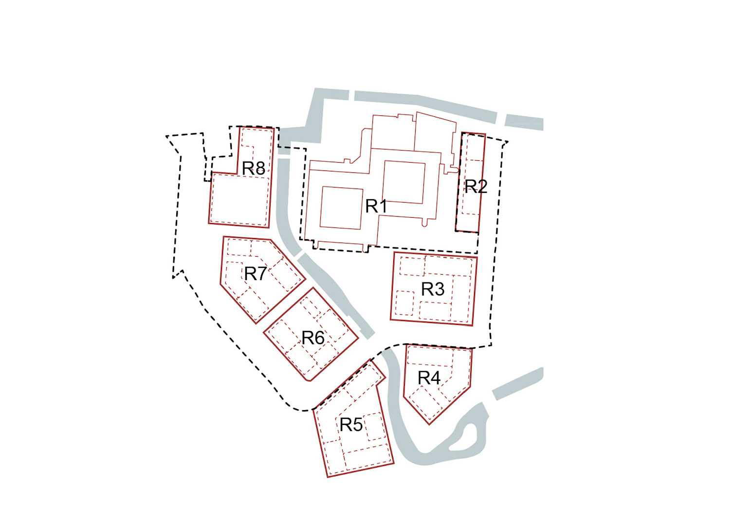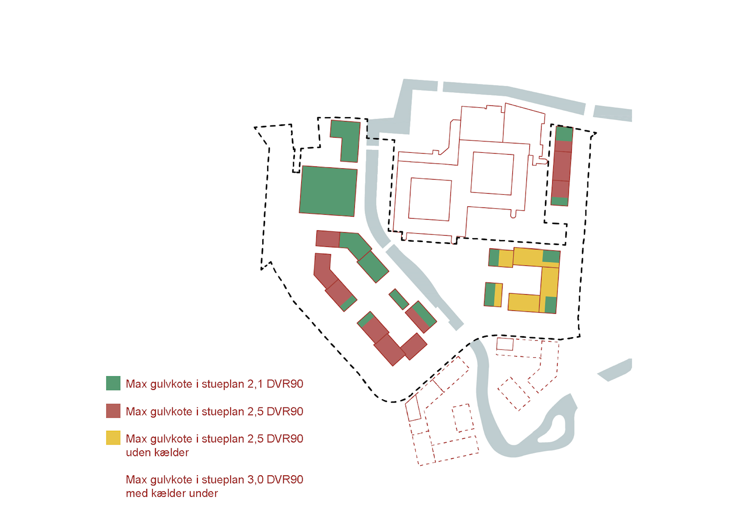Kortbilag 8a, Byggefelter (fed rød streg) og bygningsrids (rød stiplet linje).