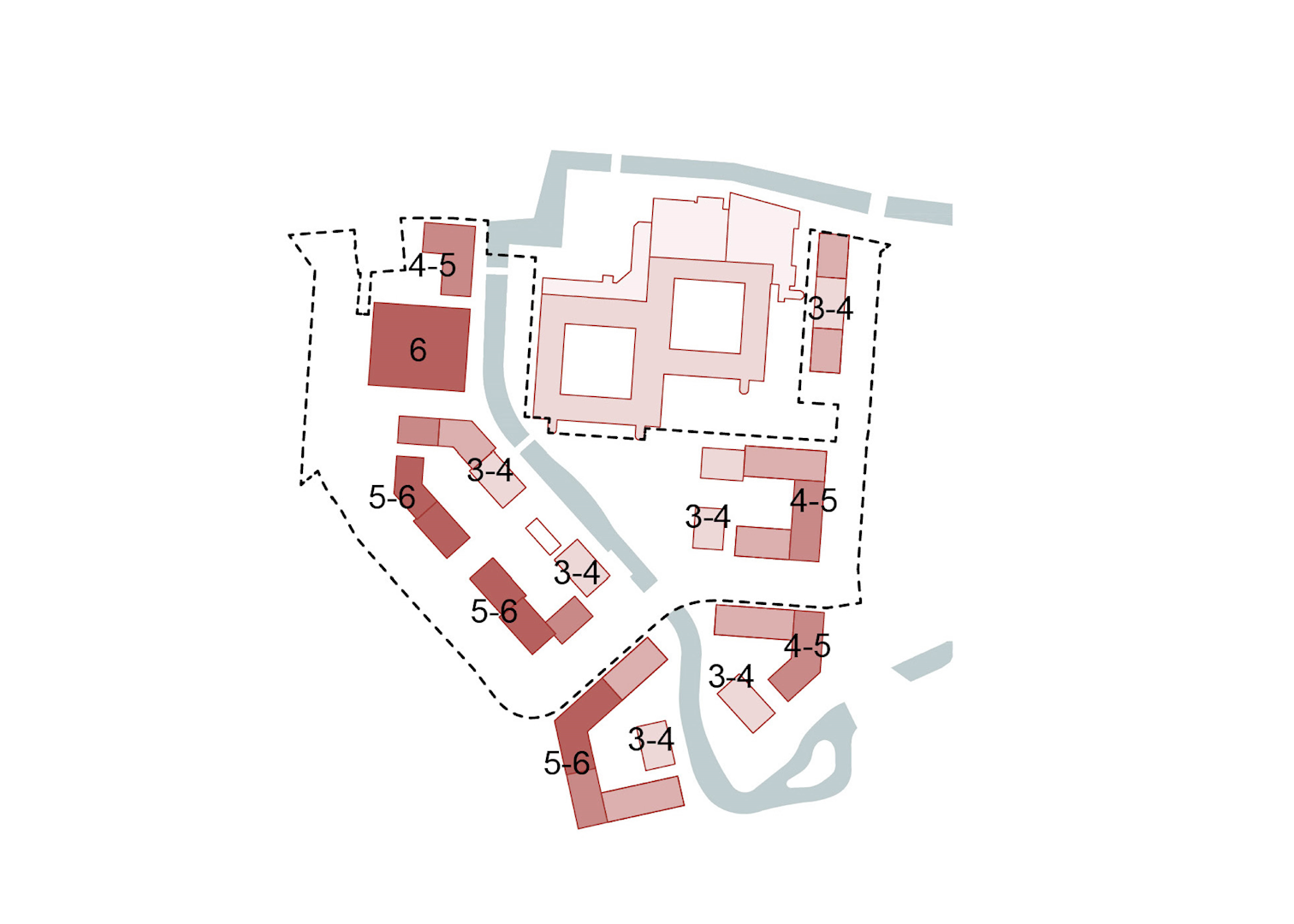 Kortbilag 8b, Bebyggelsesstruktur og højder (angivet med etageantal).