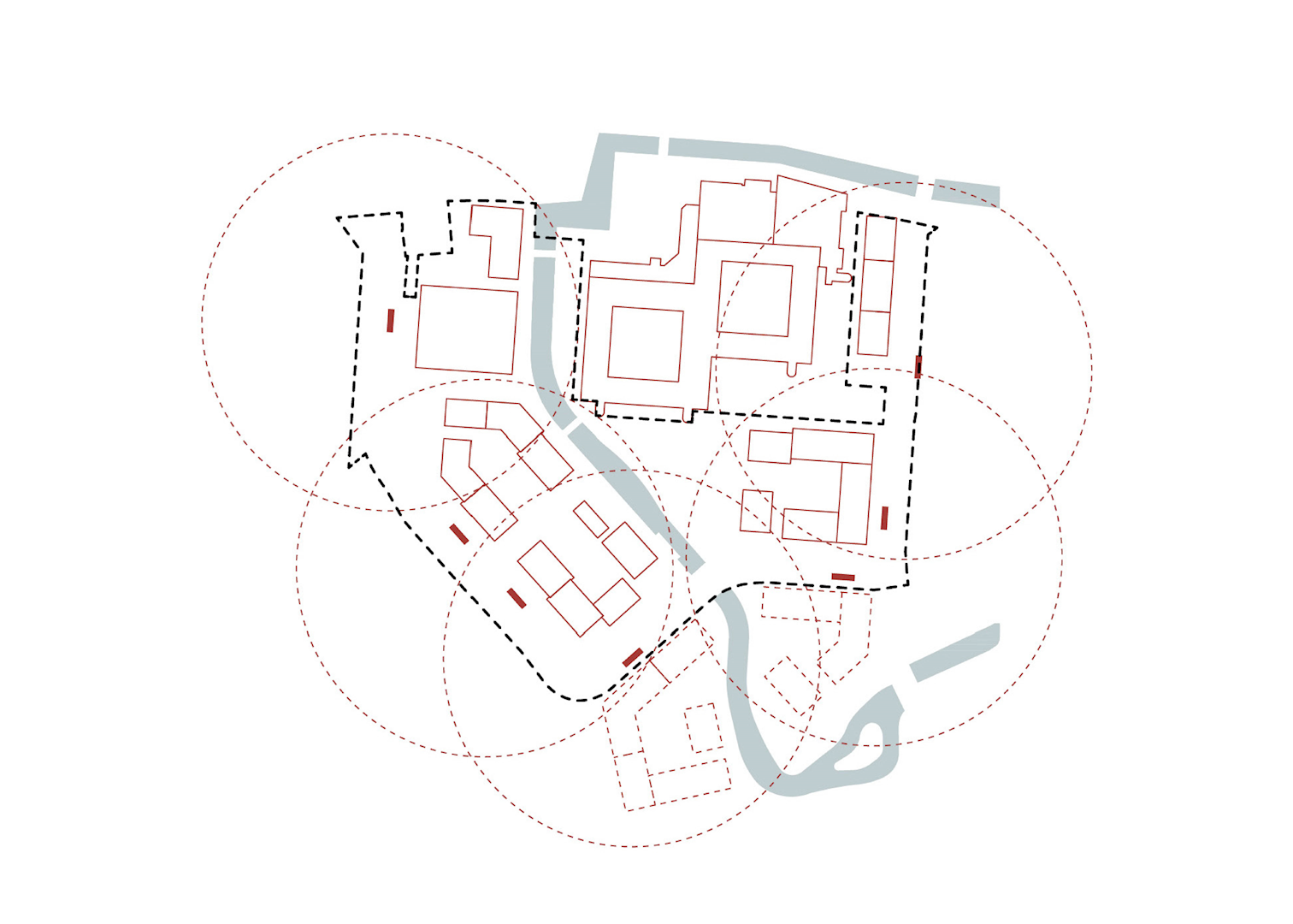 Kortbilag 8d, Placering af renovation til husholdningsaffald (røde felter er placering af nedgravede affaldsstationer, rød stiplet linje viser en 75 m radius).