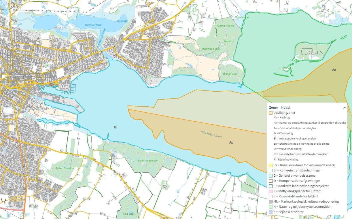 Horsens Fjord er bestemt til en generel anvendelseszone langs kysten og i havnearealerne. Centralt i fjorden findes en zone udlagt til sejladskorridor, og mod syd og øst i fjorden findes en udviklingszone til opdræt af østers og muslinger samt til kultur- og omplantningsbanker til produktion af østers og muslinger. Længere mod øst findes et større Natur- og miljøbeskyttelsesområde, som omfatter Natura 2000-områder (habitatområder og fuglebeskyttelsesområder), Ramsar-områder, natur- og vildtreservater eller områder, som er fredede.