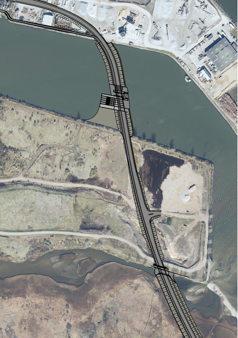 Dertil har placeringen og inddragelse af søterritoriet en funktionelle begrundelse idet vejen anlægges på dæmningskonstruktioner, som også vil indgå i den fremtidige klimasikring af Horsens midtby. Dæmningerne med tilhørende højvandssluser og pumpestation vil bidrage til fremtidig regulering af vandstanden inden for det inddæmmede areal ved forhøjet vandstand og ved kraftige nedbørshændelser. Placering af dæmningsanlægget på søterritoriet er nødvendig for at anlægget kan virke efter hensigten.