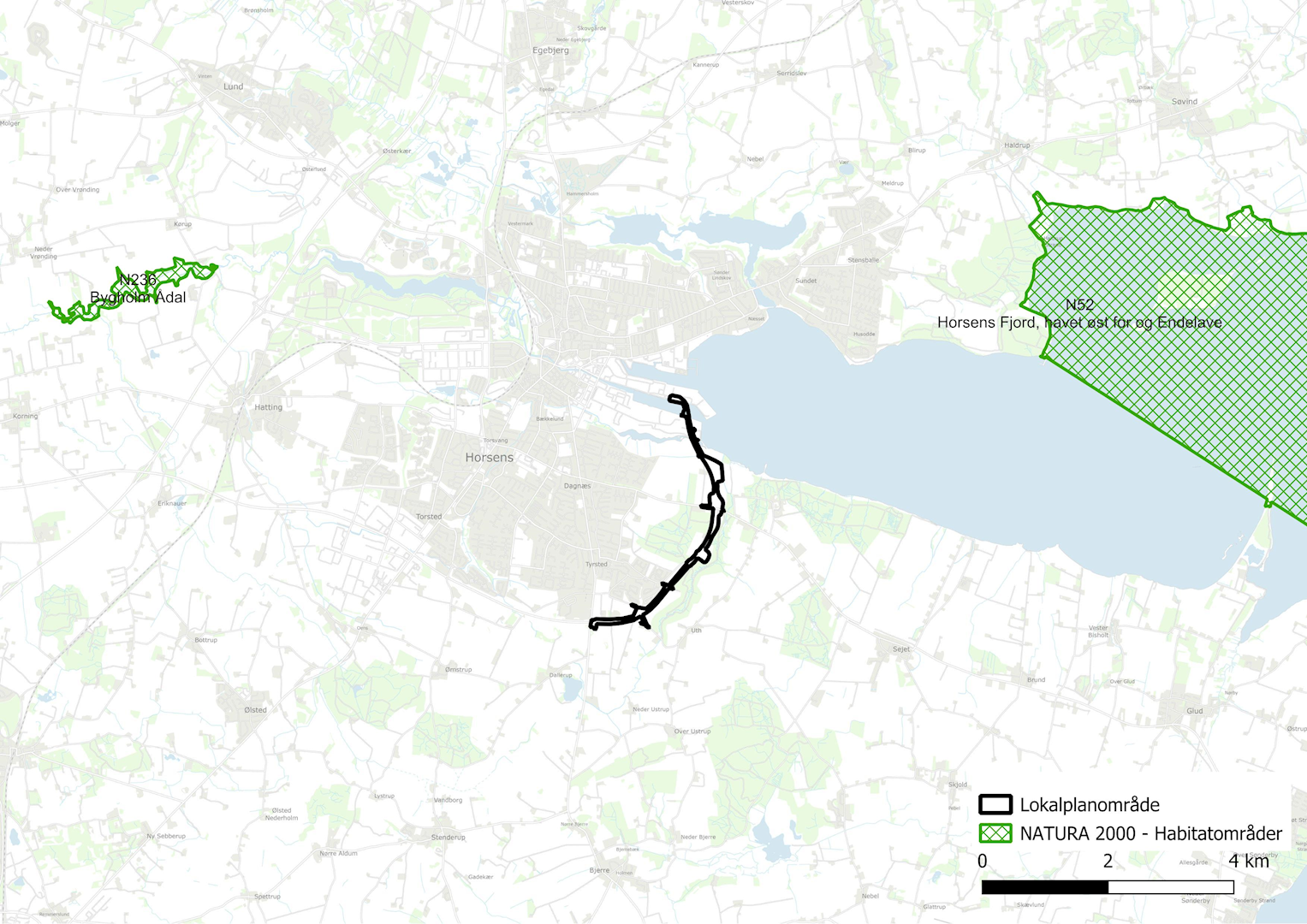 Den korteste afstand mellem vejtracé i planområdet og nærmeste Natura 2000 områder er hhv. 5 km til N56 Horsens Fjord og Endelave og 8 km til N236 Bygholm Ådal.