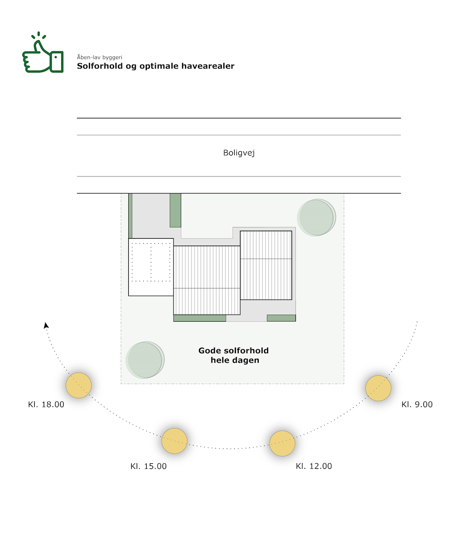 Kortbilag 9E - Solforhold og optimale havearealers placering for åben-lav byggeri indenfor lokalplanområdet. Illustrerer bestemmelsen i § 8.7.