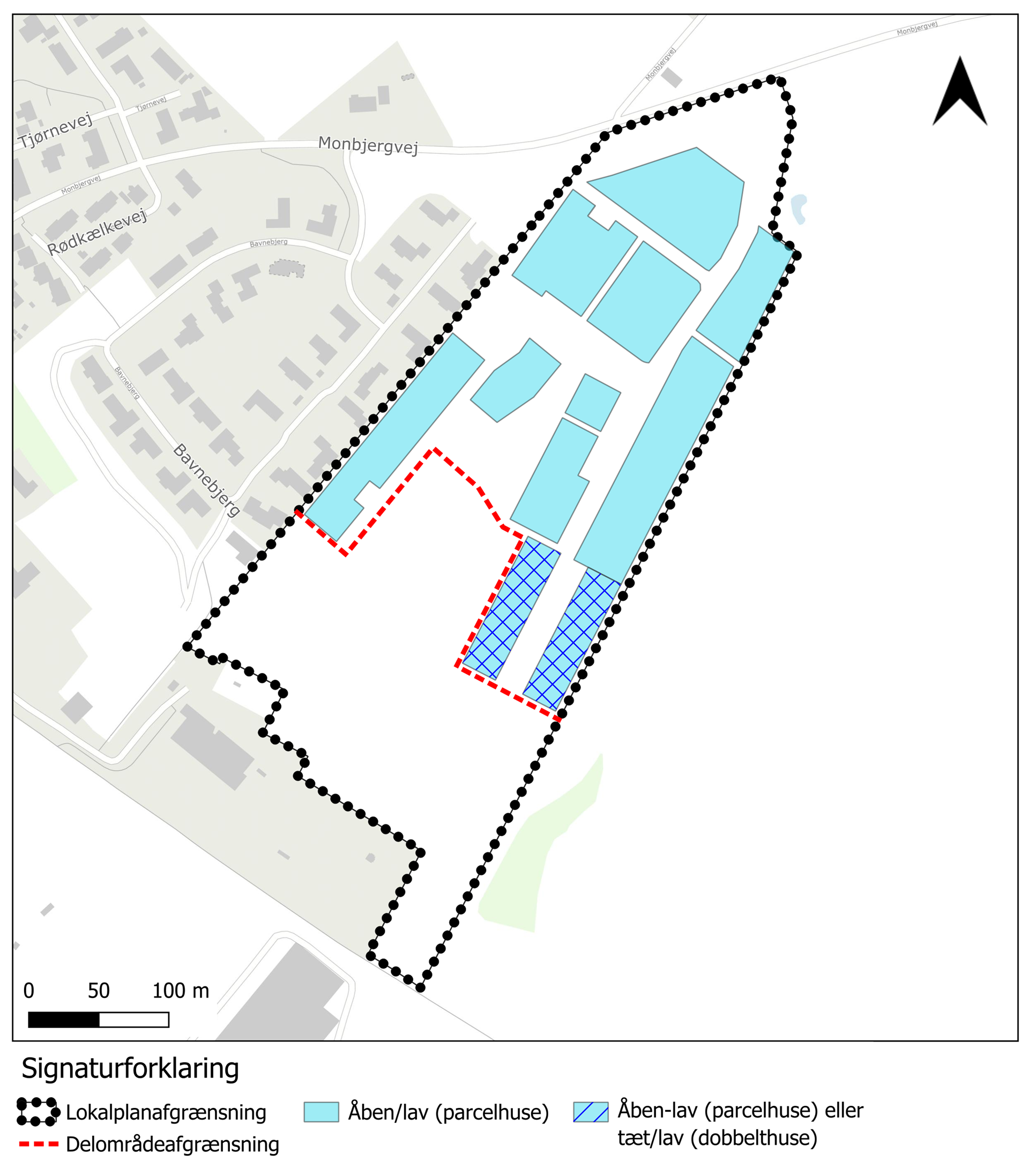 Kortbilagene danner grundlaget for de samlede principper, der understøtter gældende bestemmelser for lokalplanens forhold omhandlende delområder, typologi og placering.