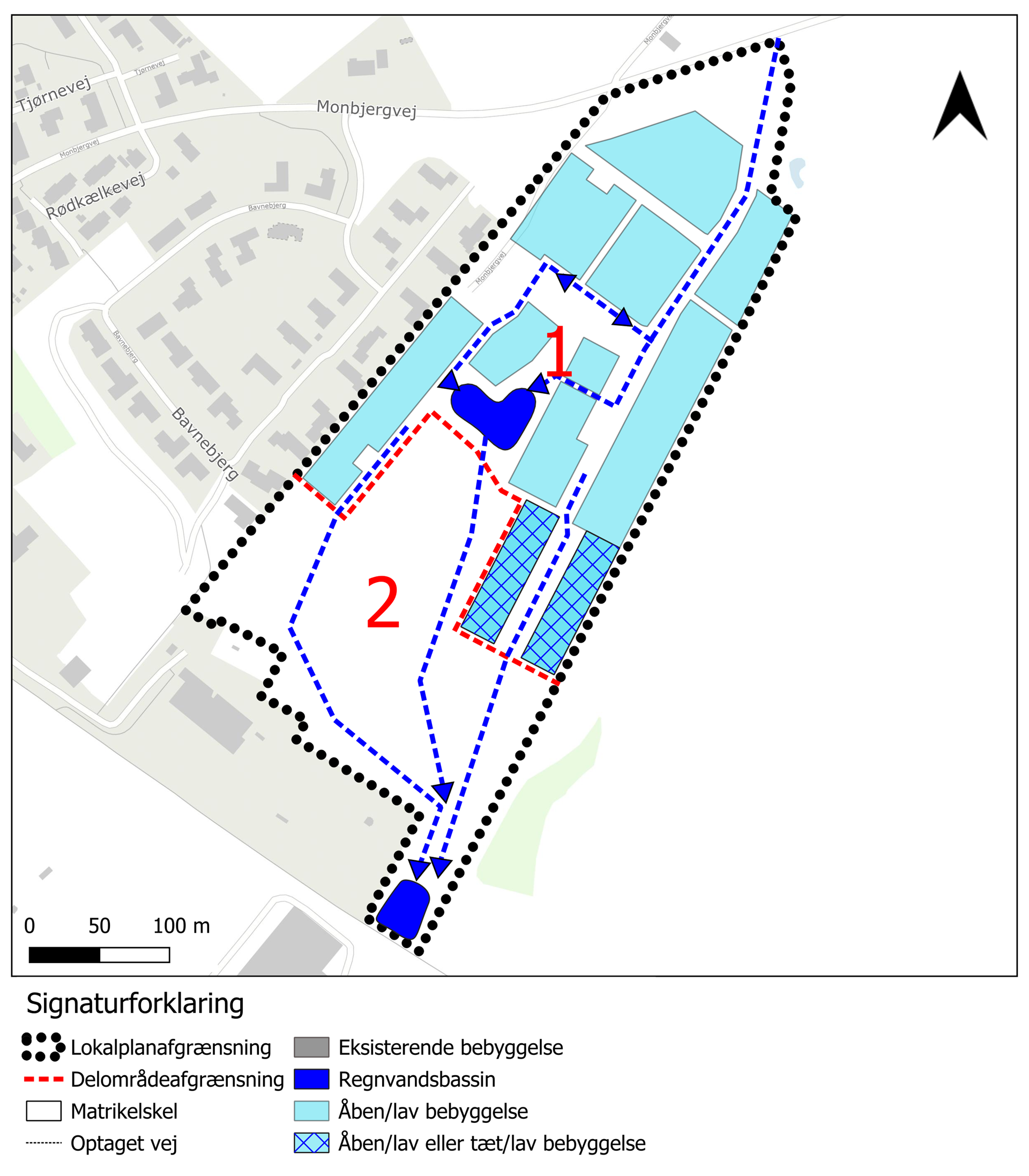 Kortbilag 8A Overordnet disponering af regnvandsoplandet indenfor lokalplanområdet. Princippet bygger på disponering jf. illustrationsplanen, kortbilag 4.