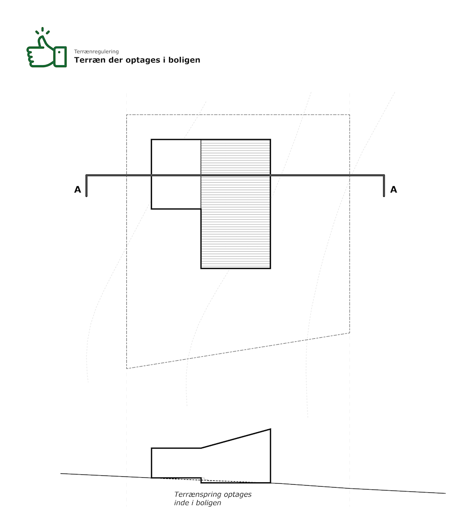 Kortbilag 5B - Princip for hvordan terræn kan optages i boligen med flere niveauplaner, således at bebyggelsen og dennes placering i landskabet sker uden unødig terrænregulering.