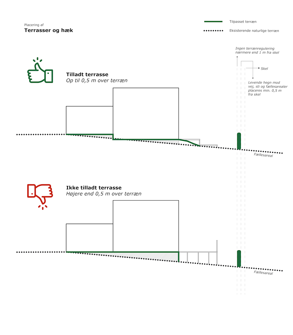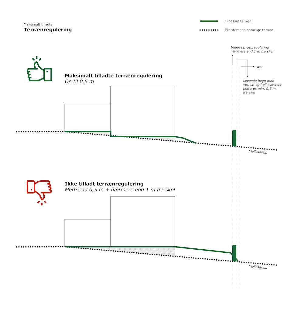 Kortbilag 5C - Illustrationen angiver den maksimalt tilladte terrænregulering. Ligeledes illustreres, hvorledes der ikke må terrænreguleres på den enkelte matrikel og hvorledes hække må placeres mod vej, sti og fællesarealer. Illustrationen understøtter bestemmelserne i §§ 10.4 og 10.7.