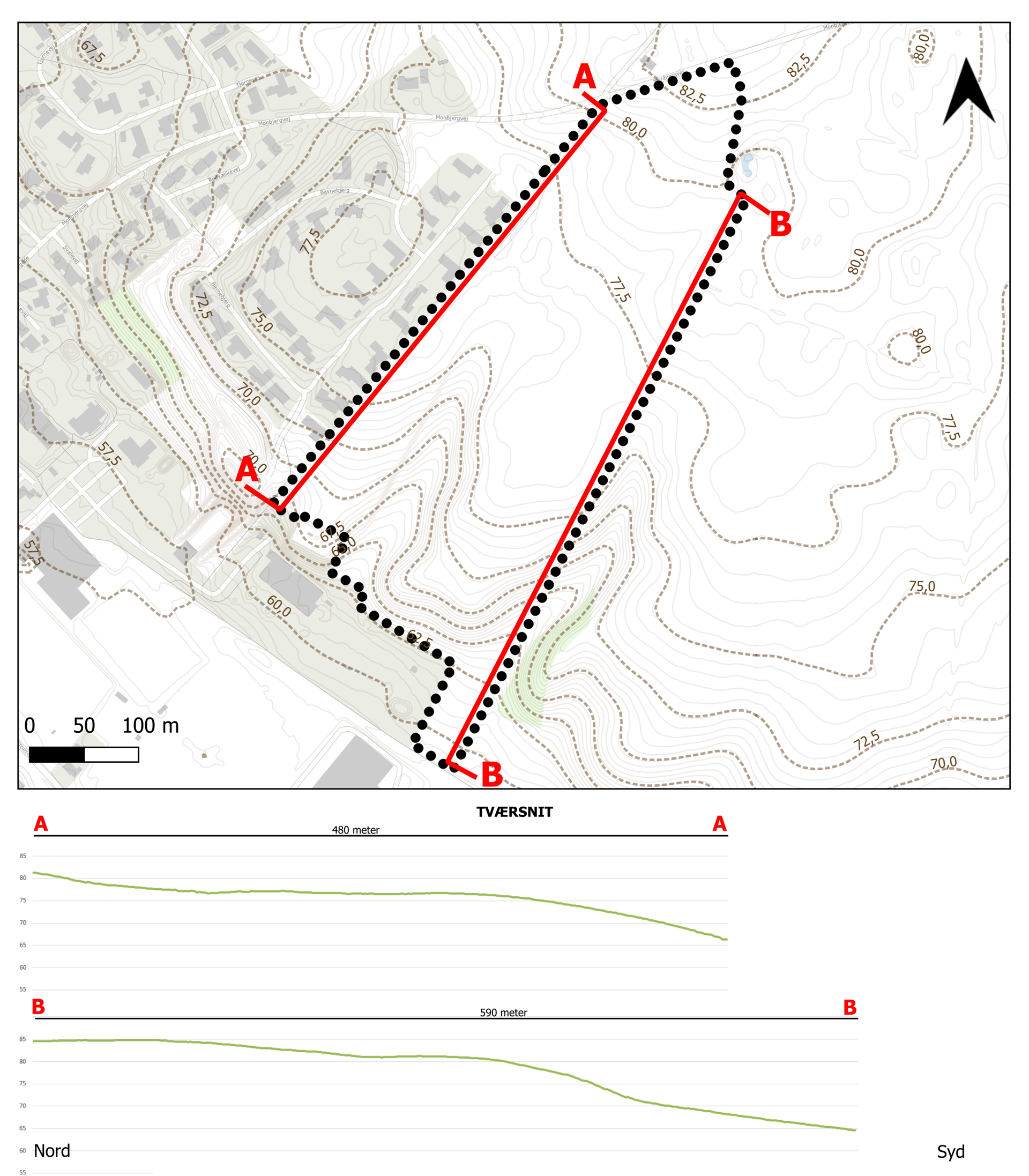 Det eksisterende terræn med højdekurver. Kortet er suppleret med to tværsnit fra nord til syd langs planens østlige og vestlige afgrænsning. Området skråner knap 23 meter fra planens nordøstlige hjørne til planens sydøstlige hjørne og 15 meter fra planens nordvestlige hjørne til planens sydvestlige hjørne.