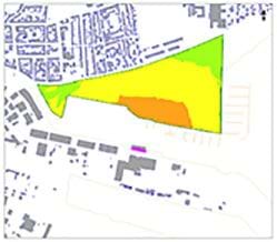 Colas støjudbredelse natperiode. Den natlige grænseværdi på 40 dB er grænsen mellem gul og grøn farve