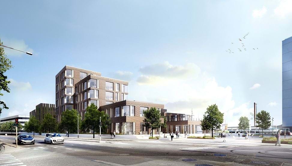 Visualisering, der illustrerer, hvordan facaderne kan tage sig ud i forhold til materialer og karakter. Der etableres en åben plads der afgrænses af bebyggelsen og Geiserne på Havnetrekanten. I baggrunden ses havnebassinet og erhvervshavnen.