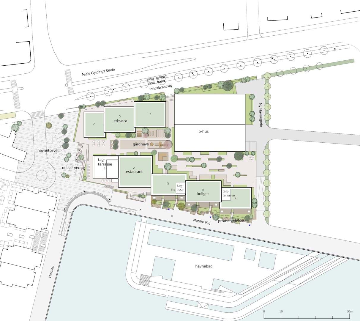 Lokalplanen fastlægger byggefelter, der sikrer bebyggelsens disponering således, at der placeres etagebebyggelse i 1-8 café langs Nordre Kaj med boliger i de østlige byggefelter og publikumsorienterede funktioner som restaurant og café i de vestlige. Bebyggelsens højde nedtrappes fra øst mod vest således, at det er den laveste del af bebyggelsen, der indeholder udadvendte publikumsorienterede funktioner, grænser op til kulturpladsen. Mod Niels Gyldings Gade kan der etableres etagebebyggelse i 2-7 etager med fortrinsvis erhverv, men også med mulighed for boliger.