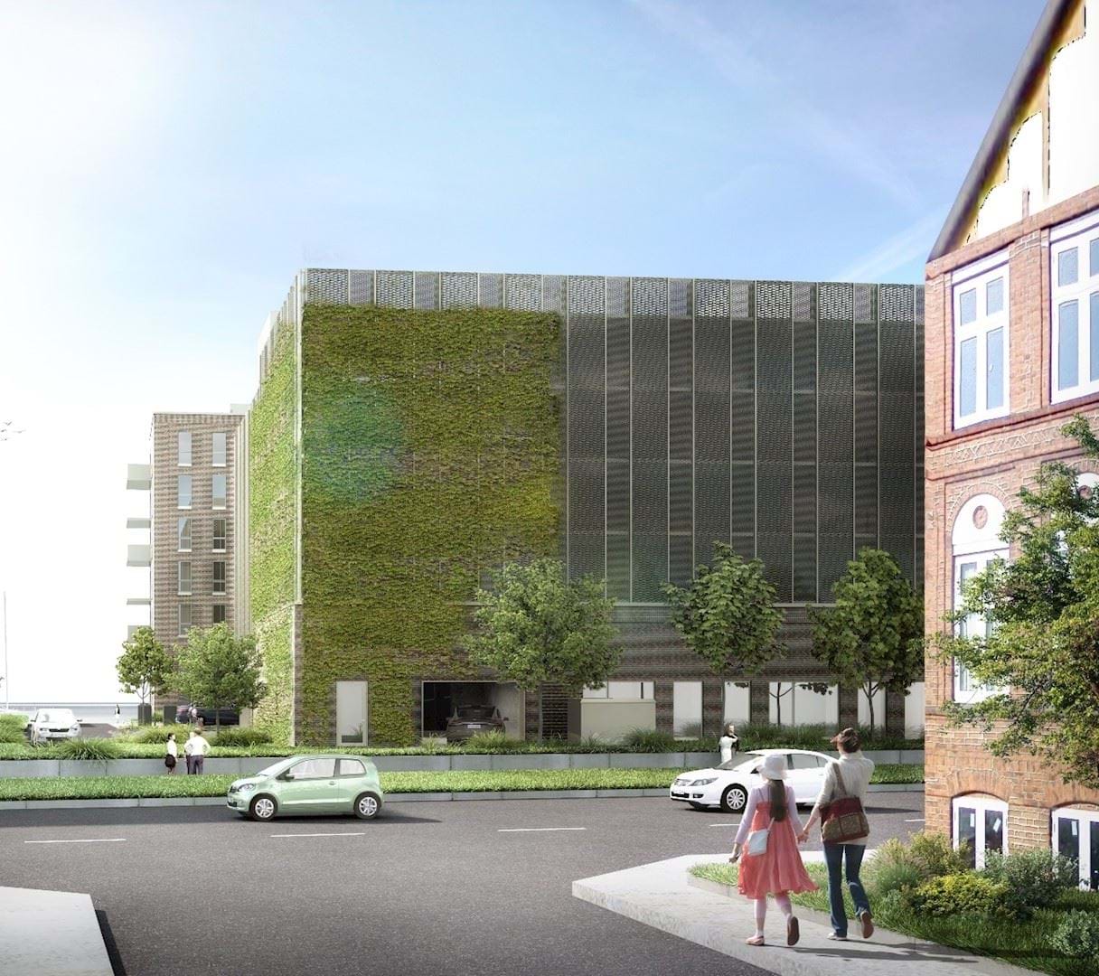 Visualisering af mulig udformning af parkeringshuset set fra Ny Havnegade/Niels Gyldings Gade. I baggrunden ses etageboliger ved kajen.