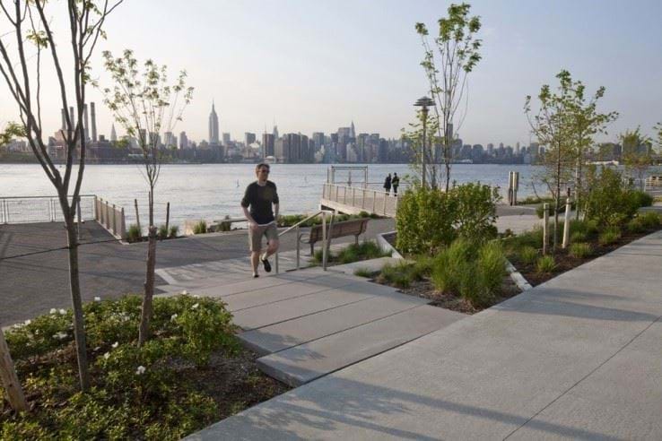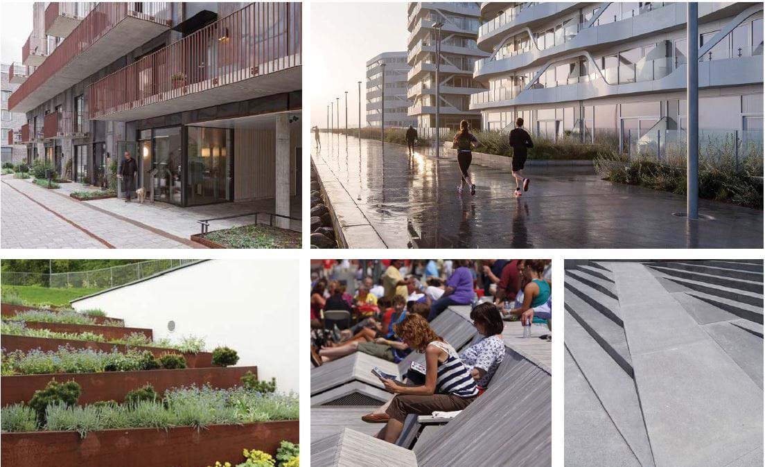 Langs promenaden udformes kantzonen mellem bygninger og promenade som hævede private terrasser med direkte udgang fra boligerne i stueetagen. Overgangszonen mellem terrasser og promenade udformes som et grønt og rekreativt element, der med eksempelvis høje græsser og mindre træer skaber en buffer mellem det private og det offentlige. Plintens kant udformes med siddetrin og opholdsnicher, der henvender sig til det liv, der udspiller sig på promenaden og i havnebadet.