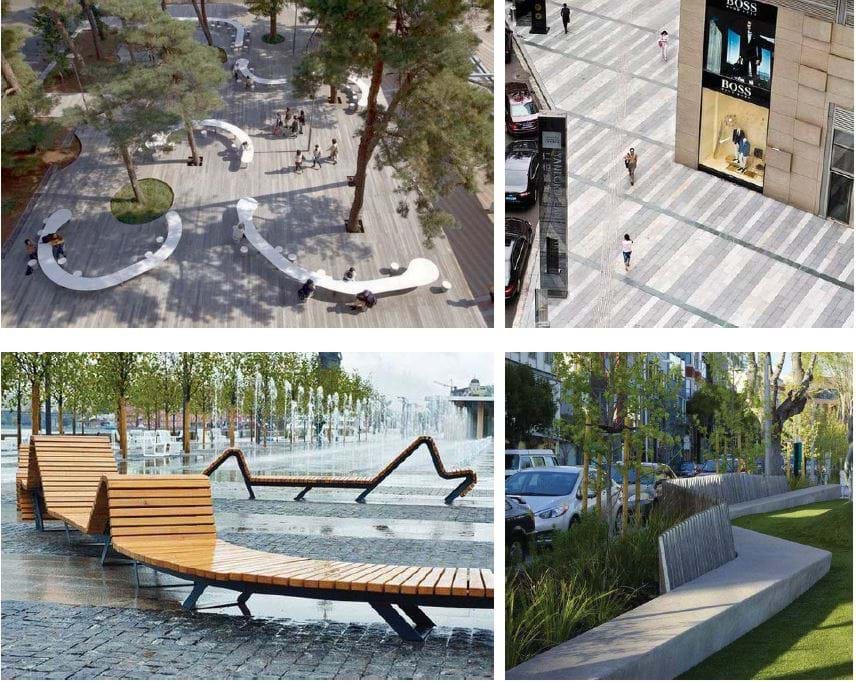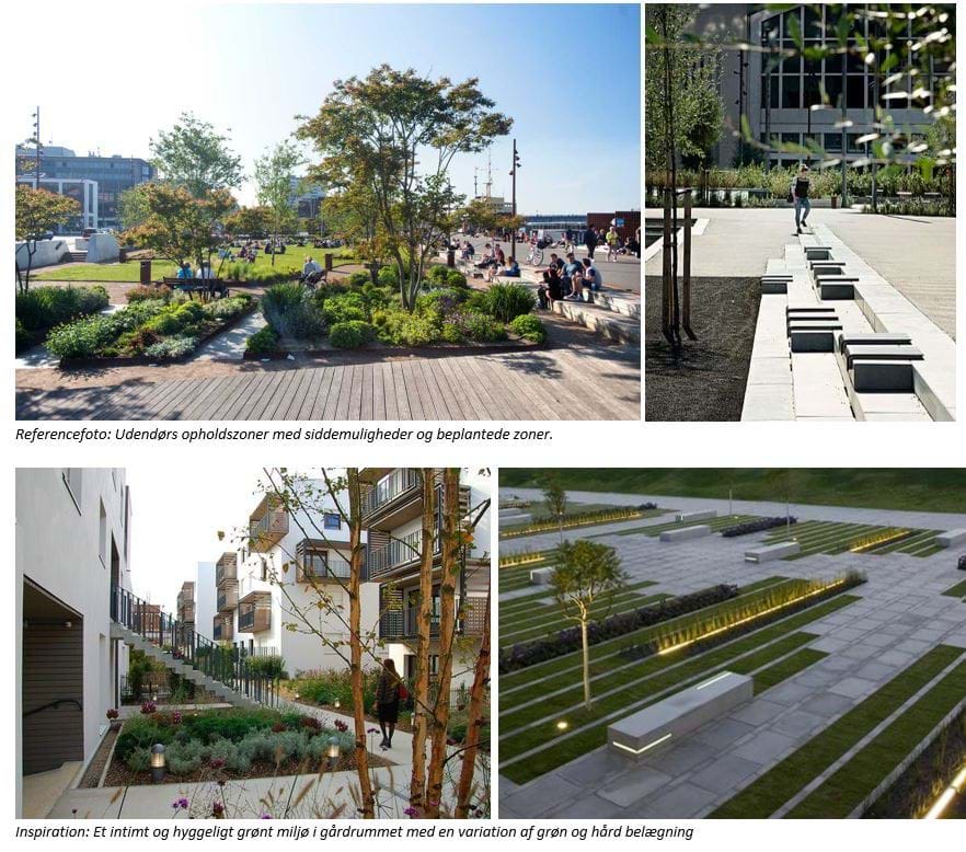 Bebyggelsen er disponeret som en opdelt karrestruktur, der giver mulighed for, at der kan etableres passager og stiforbindelser gennem bebyggelsen. Stiforbindelserne vil være sammenfaldende med opholdsarealer som fx kulturpladsen, gårdrum mv og forbinder lokalplanområdet med øvrig infrastruktur. Disponeringen af bebyggelsen skaber ligeledes mulighed for et sammenhængende gårdrum, der inddeles i grønne nicher og arealer til ophold og cykelparkering. Gårdrummet er via trapper, rampe og siddetrin forbundet med kulturpladsen og promenaden. Lokalplanen giver desuden mulighed for øvrige opholdsarealer i form af altaner, terrasser og tagterrasser. Udendørs opholdsarealer på terræn skal have en variation af blød og hård belægning med stedsspecifik beplantning.