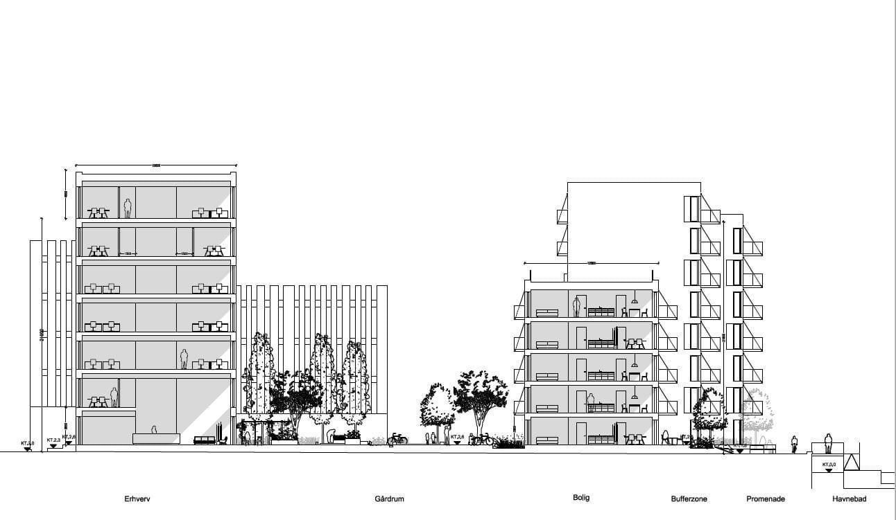 Snit gennem bebyggelsen på en plint i kote 2,6 og promenaden i kote 1.8.