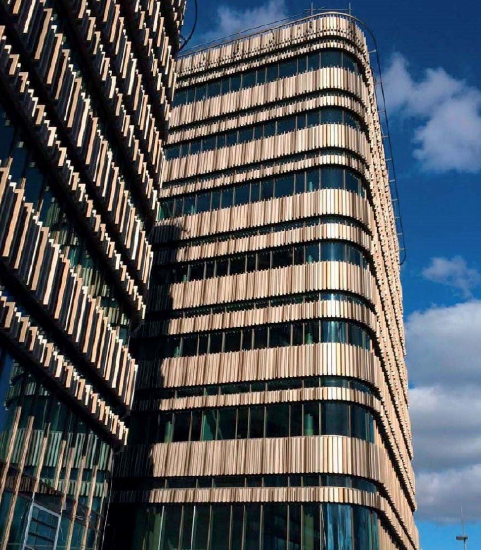 Bygningen fremstår i jord-/ naturfarver/ kobber.