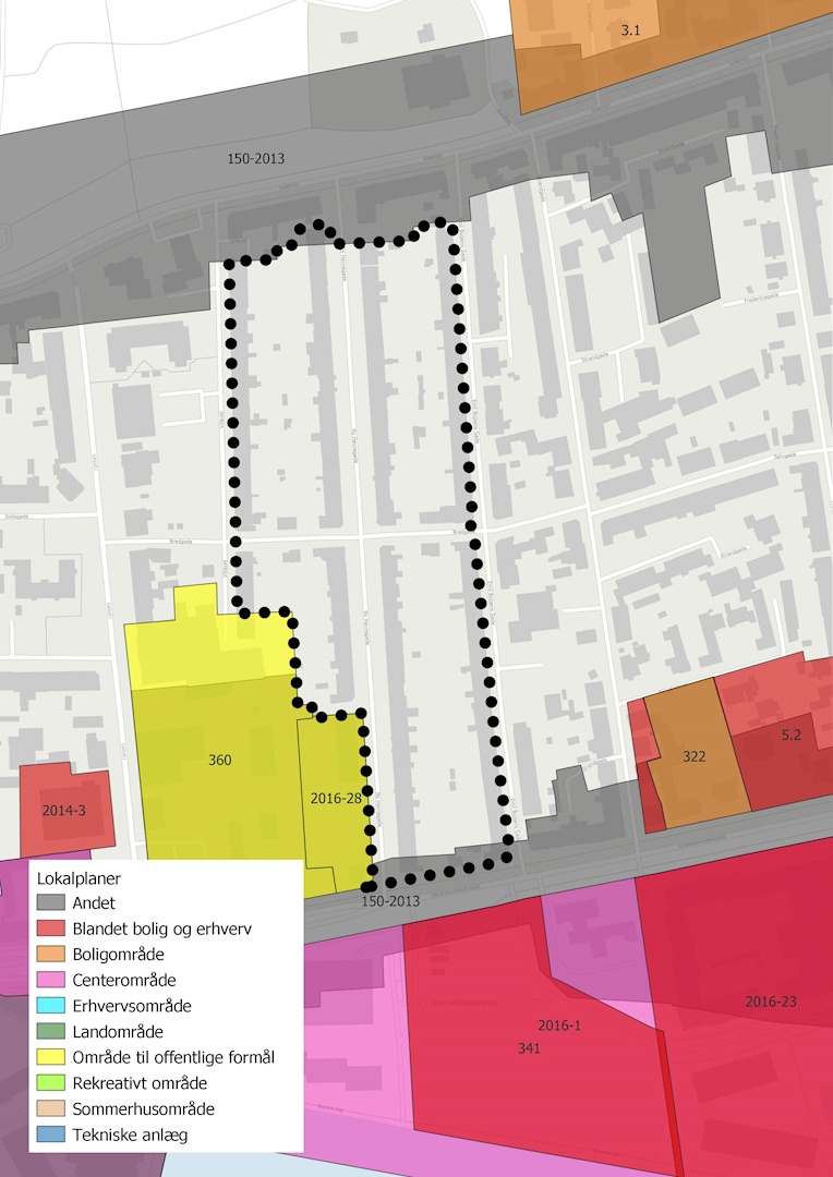 Kort med angivelse af hidtil gældende lokalplaner i området. Afgrænsning af nærværende lokalplanområde er vist med prikket signatur. Heraf fremgår det, at dele af nærværende lokalplanområde er omfattet af Lokalplan 150-2013.