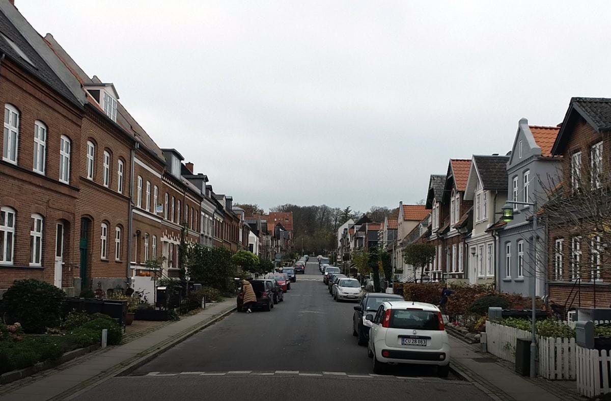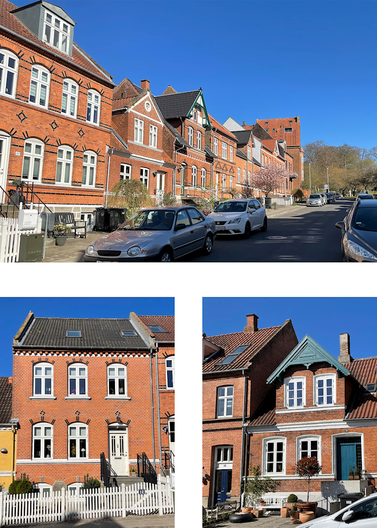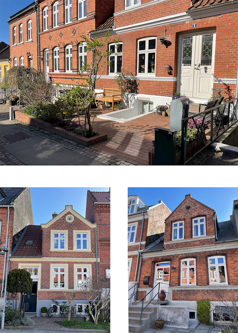- Fotos af eksisterende forhold i Emil Bojsens Gade - øverst ses byhuse, der følger terrænfaldet og nedtrappes gradvist mod fjorden. Nederst ses to fotes af karakteristiske facader i gadebilledet.