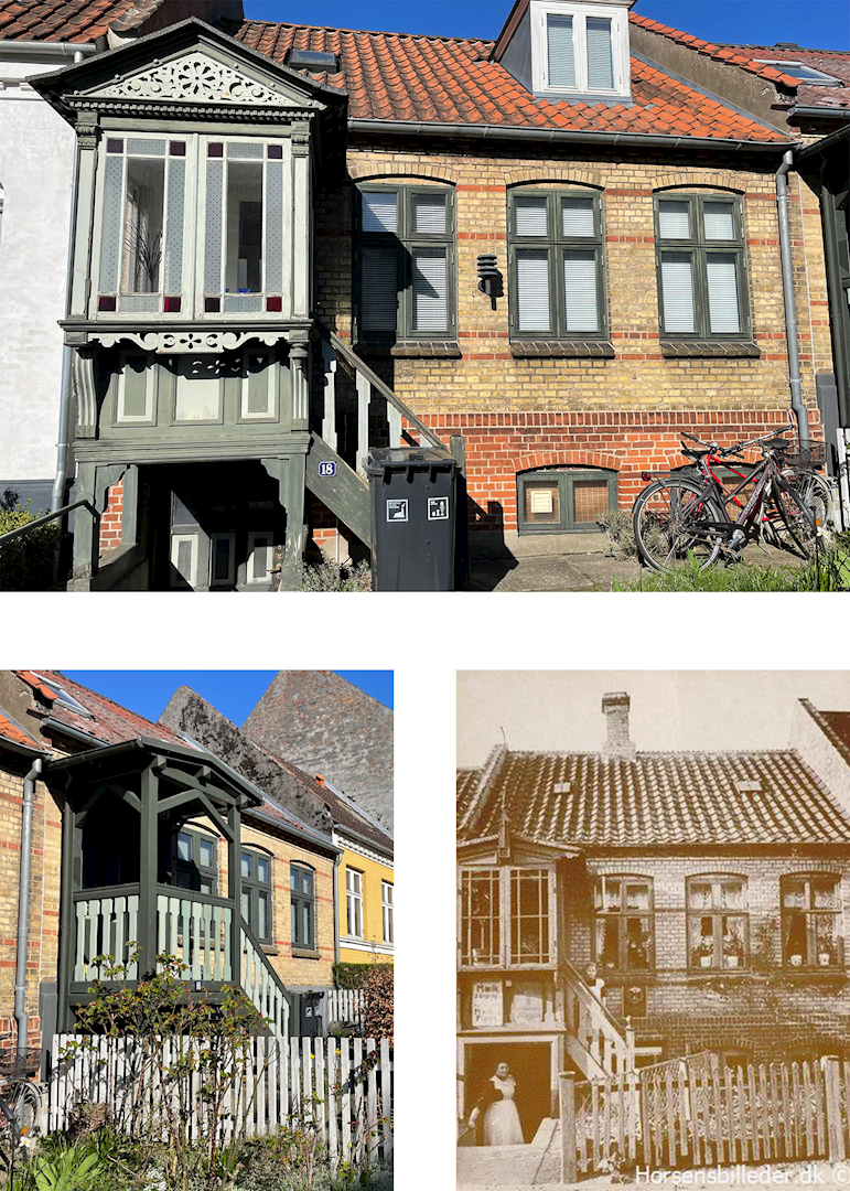 Fotos af to eksisterende overdækkede indgangspartier/verandaer og ét historisk foto af overdækket indgangsparti/veranda i Ny Havnegade, 1915 - Copyright: Horsensbilleder.dk