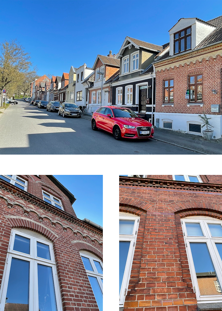 Fotos af eksisterende forhold på Villavej - byhuse med pudsede facader og med facader i røde mursten. På de nederste to fotos ses detajlering med murede stik og bånd på facaderne.
