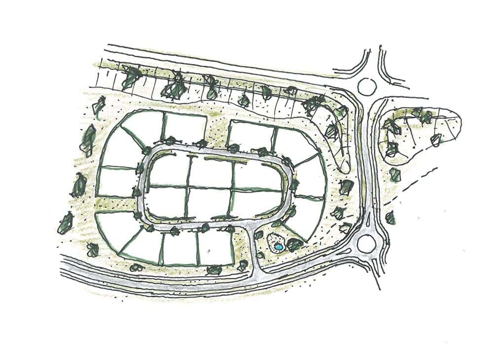 Illustrationsplan af lokalplanområdets veje, byggegrunde og grønne områder og dets næromgivelser.