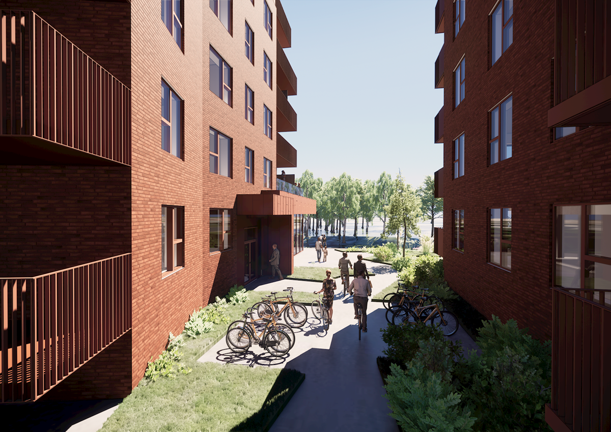 Visualisering af mulig udformning af byggeri set mellem de to nye bygninger.
